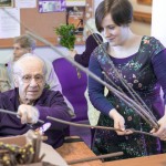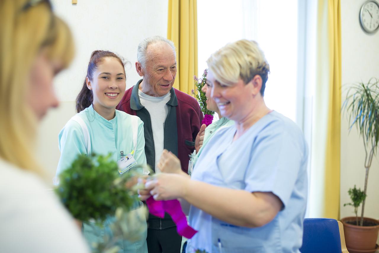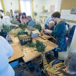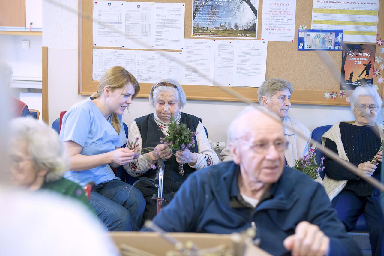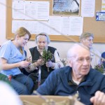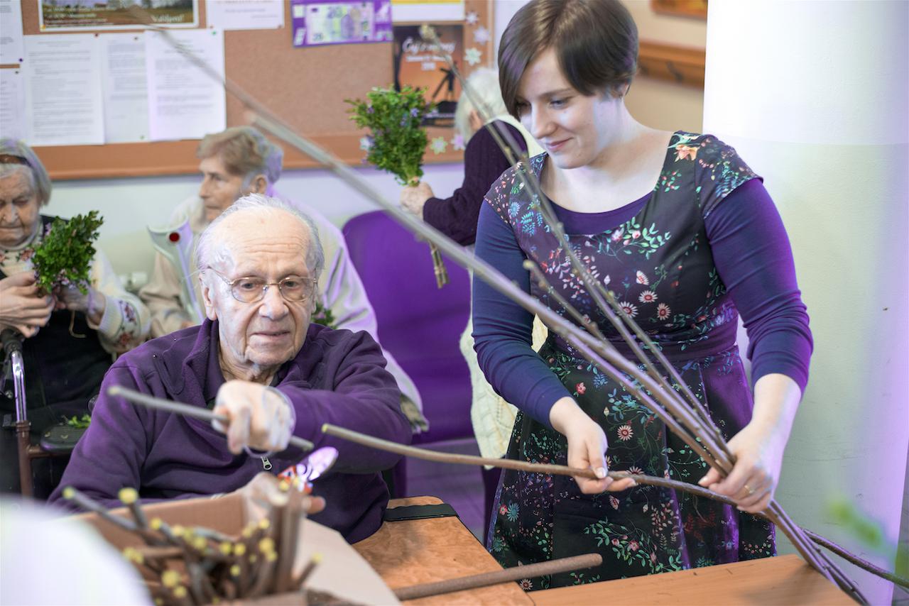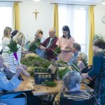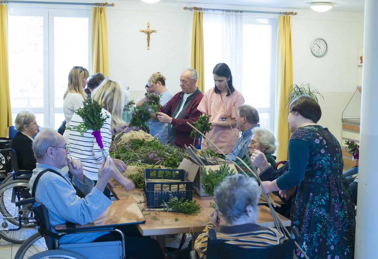 Tako veselo je bilo tudi danes dopoldne pri nas, ko smo se ob izdelavi butar skupaj družili stanovalci, zaposleni, prostovoljci, članice Vincencijeve konference in prav vsak je poprijel za delo. Pridno in s spretnimi rokami smo v butare spletali različno spomladansko zelenje in šibje (oljčne vejice, pušpan, lesko,..), polepšali pa smo jih s pisanimi trakovi.