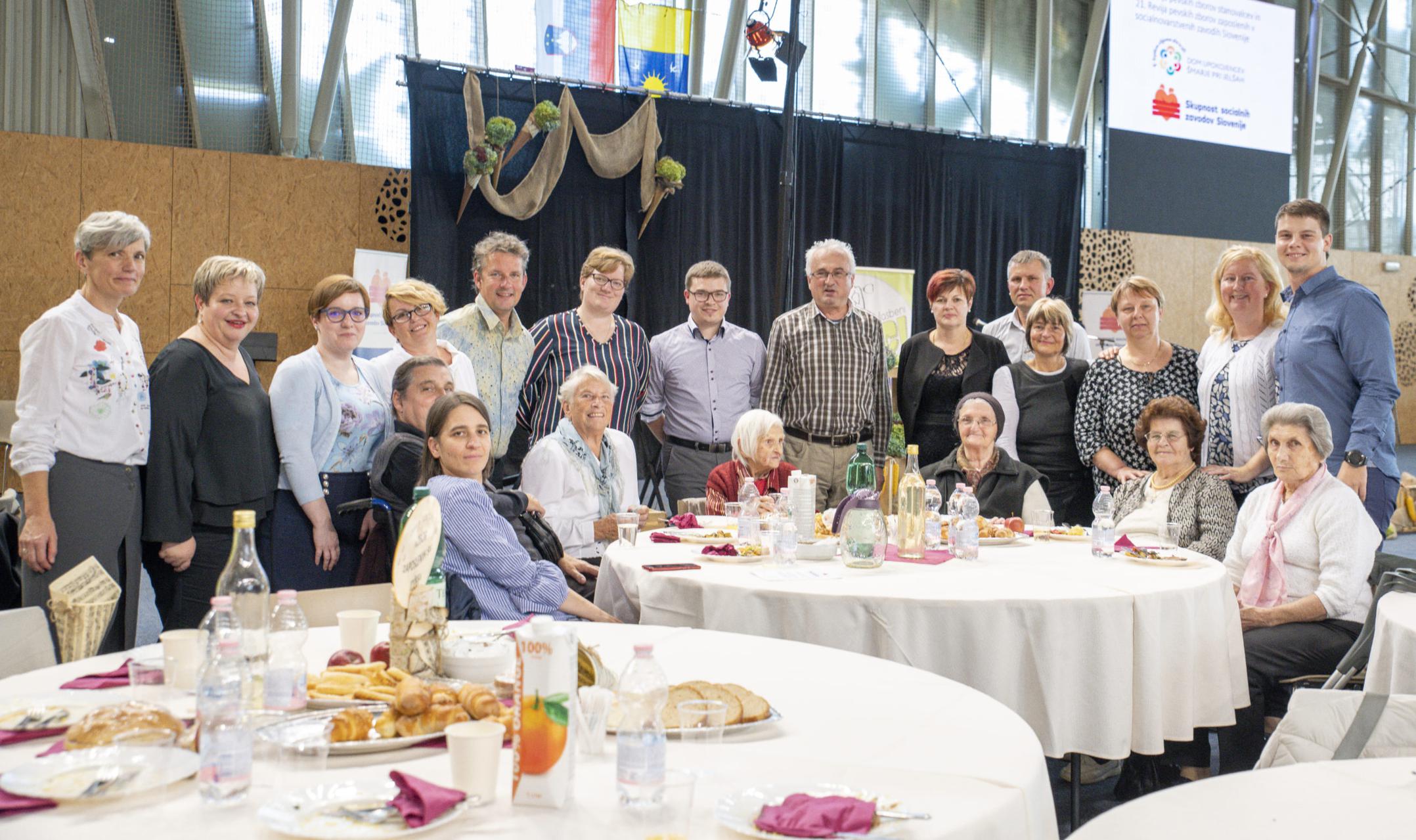 (skupna fotografija s srečanja revije zborov stanovalcev in zaposlenih varstev starejših 2019; srečanje v sproščenem duhu, na katerega kaj kmalu spet upamo in verujemo)