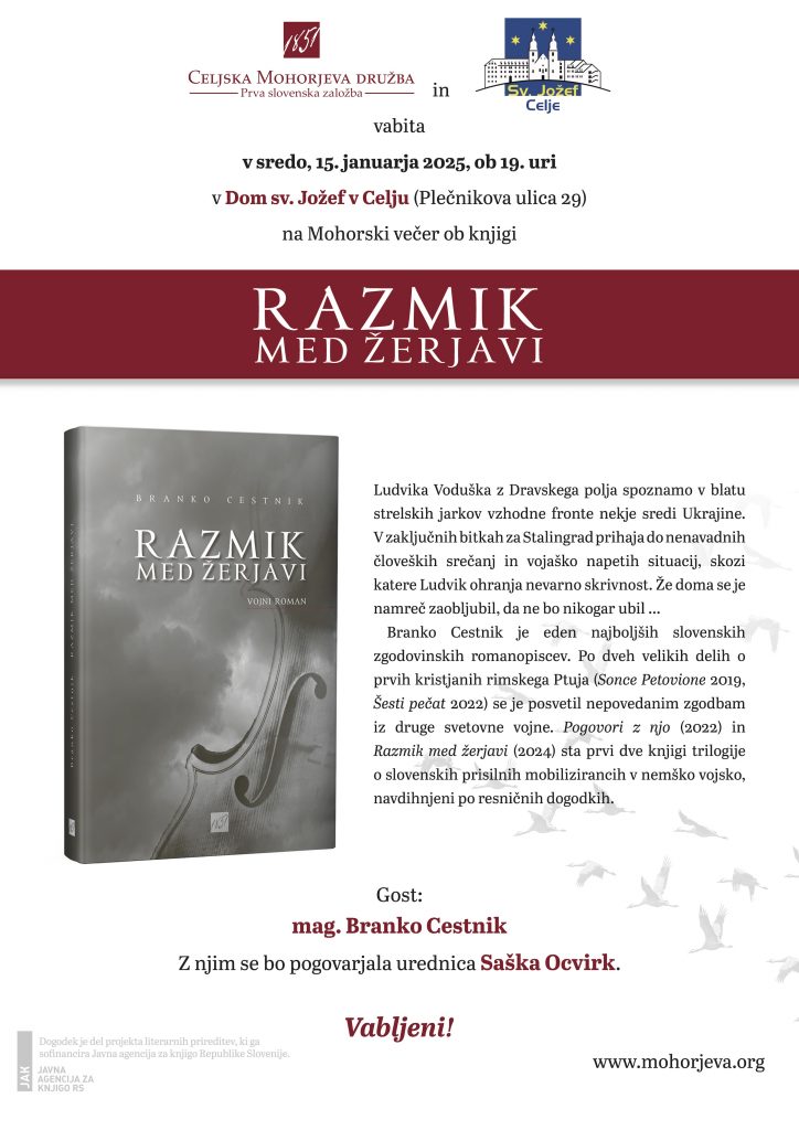 P. Branko Cestnik je nedvomno eden najboljših sodobnih zgodovinskih romanopiscev. V svojem četrtem romanu Razmik med žerjavi (Celjska Mohorjeva družba, 2024) se je posvetil slovenskim vojaškim mobilizirancem v drugi svetovni vojni. Popelje nas na vzhodno fronto, v Ukrajino, kjer se Ludvik Vodušek z Dravskega polja udeleži zaključnih bitk za Stalingrad. Pri tem prihaja do človeško zanimivih srečanj in vojaško napetih situacij, še posebej zaradi njegove zaveze neubijanja. Ludvik kljub nevarnosti, da ga razkrinkajo in obtožijo dezerterstva, vztraja do nepredvidljivega konca. Navdih za zgodbo so bila resnična pričevanja številnih slovenskih mobilizirancev, ki so v nemški vojski odigrali prav takšno vlogo tihih pacifistov.