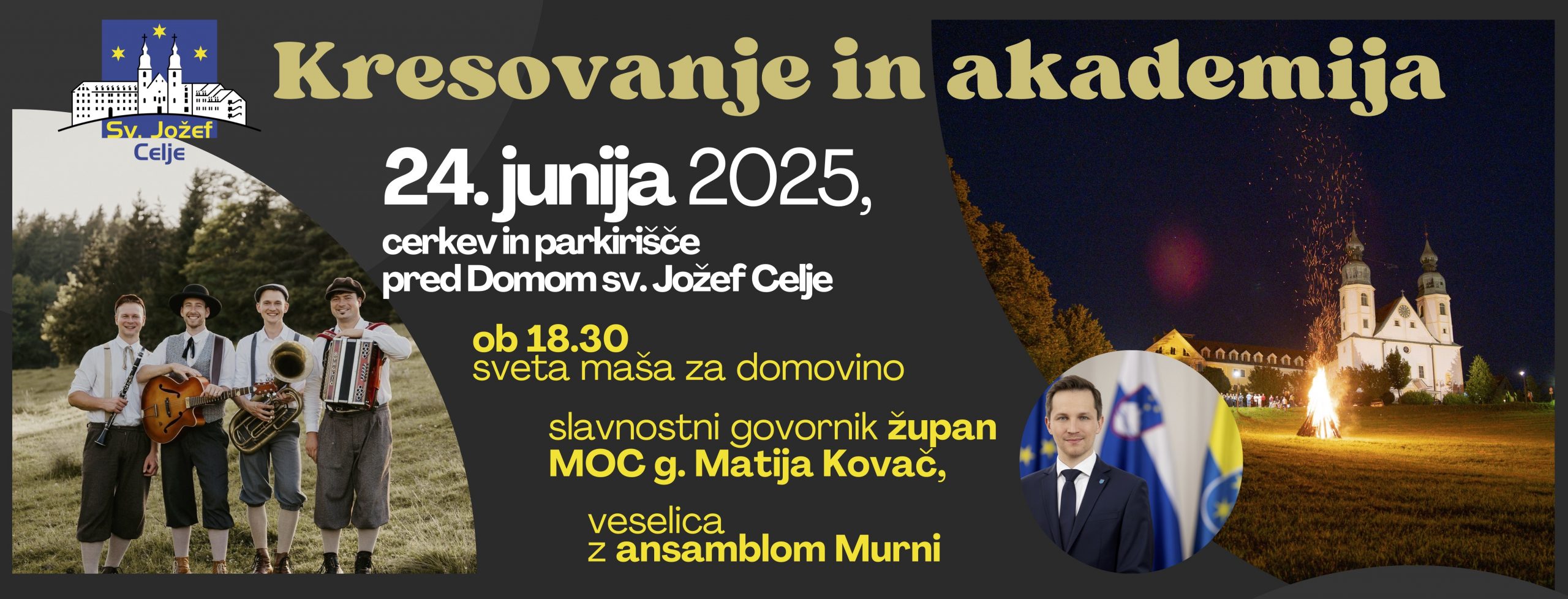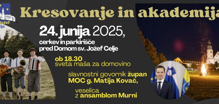 kar se nam bo dogajalo v torek zvečer, ob Kresu in na predvečer praznika naše domovine. Začeli bomo ob 18.30 s sveto mašo za domovina, nadaljevali z druženjem na dvorišču ob glasbi, pijači in jedači. Ob približno 21. uri bomo pozdravili našo domovino s slavnostno akademijo in nato prižgali kres ter nadaljevali druženje v noč. Poleg domačih pevcev vseh zborov bo z nami še Godba na pihala s Svetine. Za razpoloženje na dvorišču bo skrbel ansambel Murni, slavnostni govornik pri akademiji pa bo naš župan, g. Matija Kovač. Ves čas, razen med akademijo, bo poskrbljeno za pijačo in jedačo. Ob večeru bo potekal tudi bogat tombolski srečelov. Izkupiček tega kakor tudi celotnega večera je namenjen nabavi terapevtskega laserja v varstvu starejših našega Doma. Zares lepo povabljeni in povabite ter spodbudite še druge, naj bo to zares nas večer. Dogajanje bo ob vsakem vremenu, v primeru dežja se bomo umaknili v avlo in dvorano.