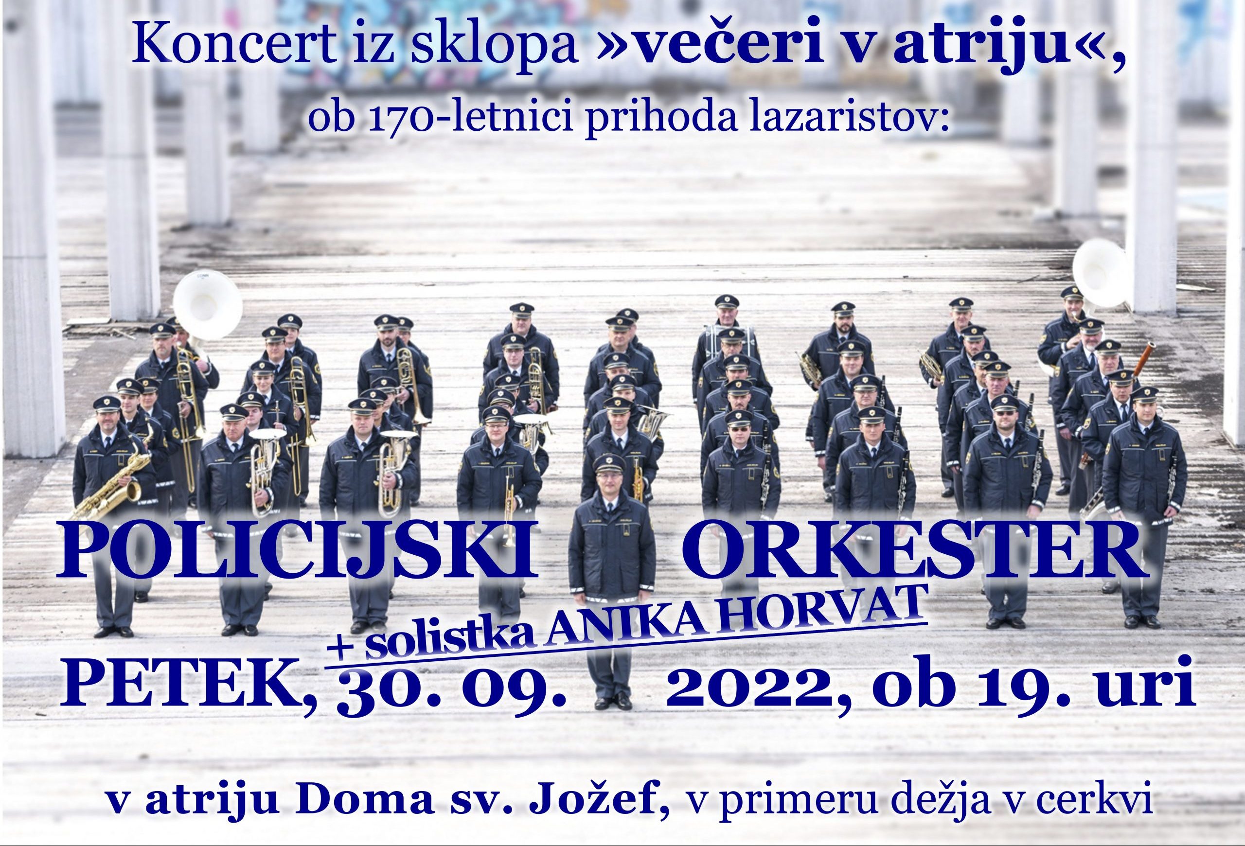 Koncert Policijskega orkestra ob 170. letnici lazaristov v Celju bo v petek zvečer ob 19. uri v atriju, oziroma v primeru dežja v cerkvi. Z njim bomo sklenili »večere v atriju« in počastili obletnico – že sto sedemdeseto – prihoda lazaristov na Jožefov  hrib in v Avstrijsko monarhijo.  Drugega praznovanja ne bo, zato toliko bolj lepo povabljeni, da se ta večer ob dobri glasbi, besedi in tudi nazdravitvi res poveselimo. Poleg orkestra, ki nas bo počastil s svojim nastopom, bo z njimi tudi solistka Anika Horvat. Nagovoril nas bo naš vizitator, prof. dr. Robert Petkovšek. Povabite na praznovanje in koncert še sosede in znance.