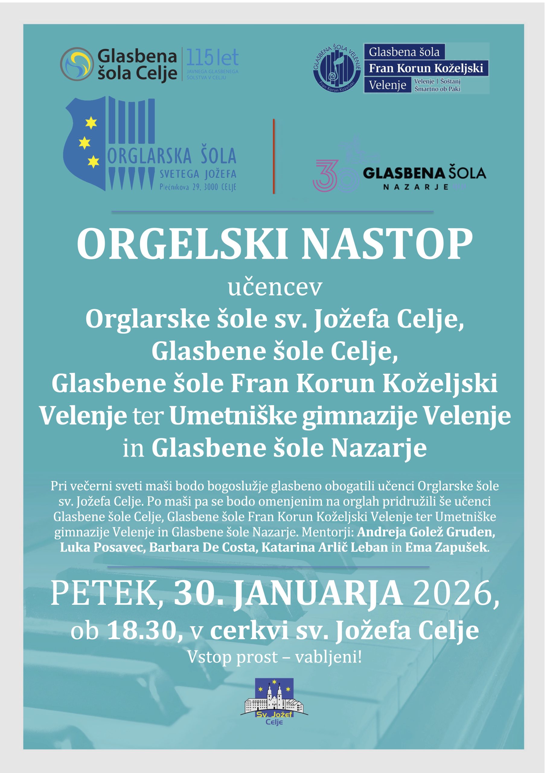 sv. Jožefa Celje. Po maši pa se bodo omenjenim na orglah pridružili še učenci Glasbene šole Celje, Glasbene šole Fran Korun Koželjski Velenje ter Umetniške gimnazije Velenje in Glasbene šole Nazarje.