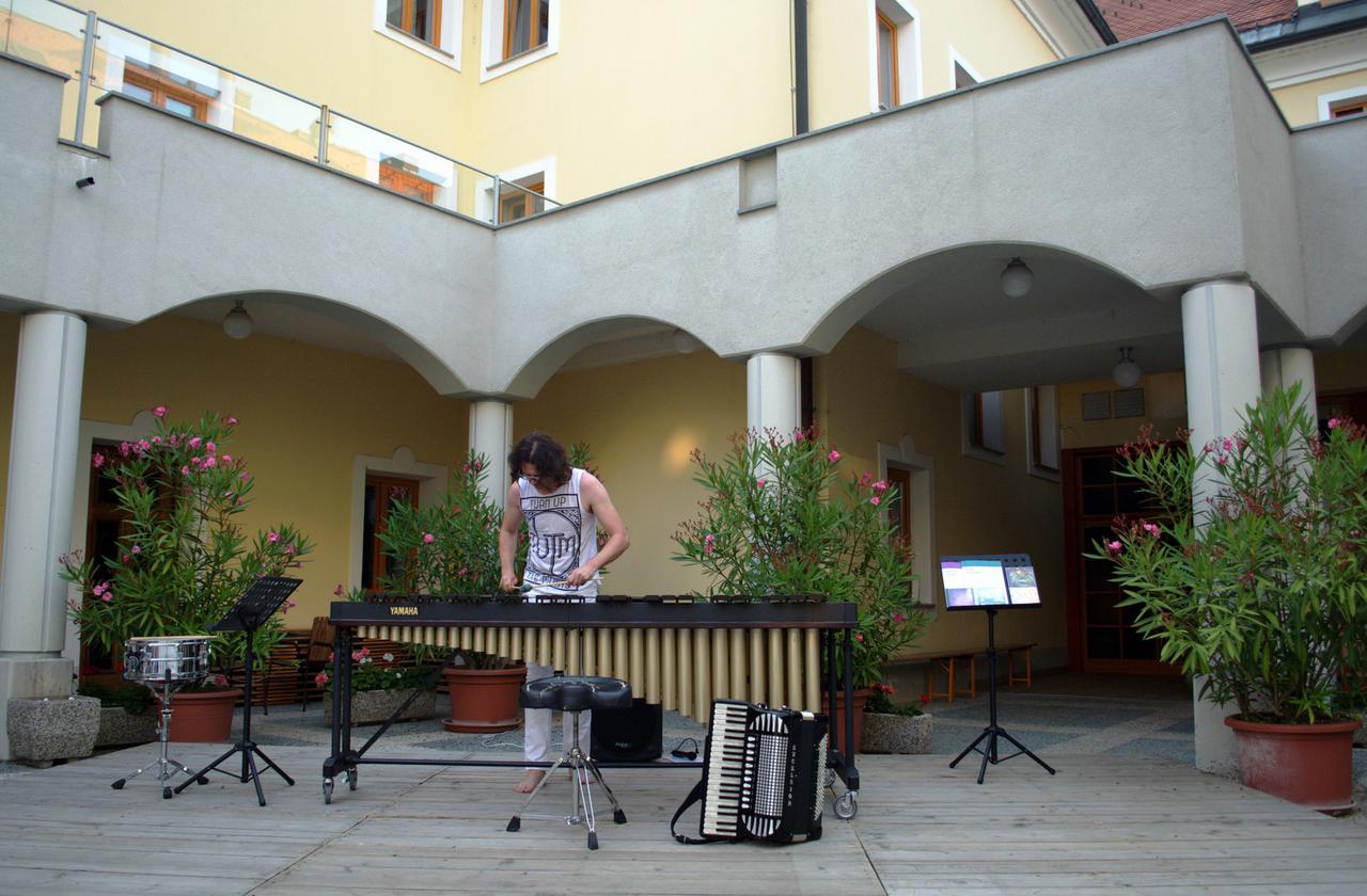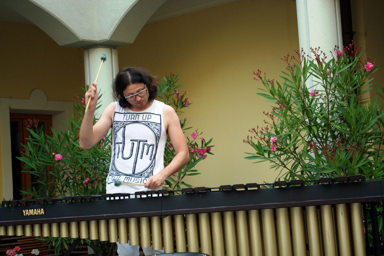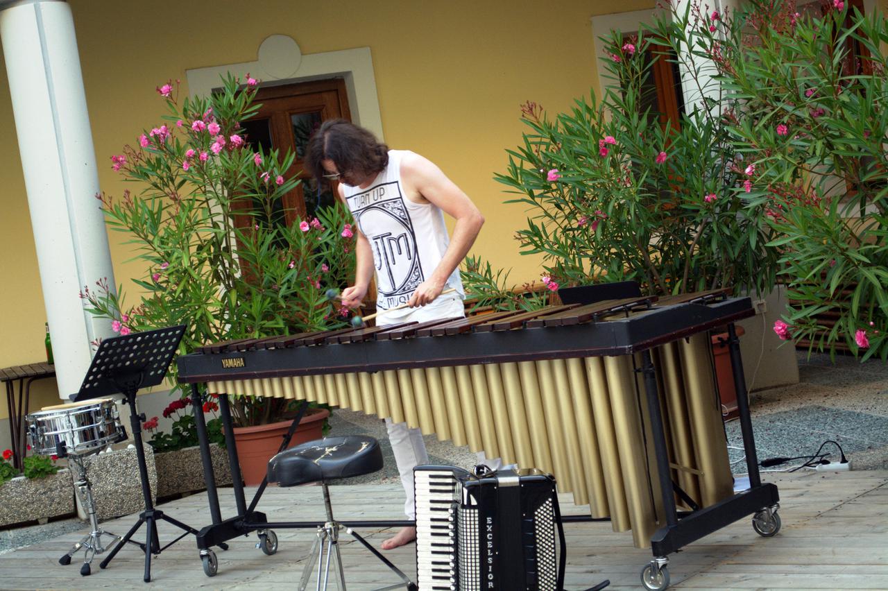 V nedeljo, 5. julija, je naš atrij zadonel pod lesenimi paličicami profesorja tolkal, Grega Gorenška, iz Konzervatorija za glasbo v Mariboru. Poleg Salut de Geneve na snare bobnu, odlični priredbi Suite v H molu J. S. Bacha., ter izvedbi Koncerta za marimbo, nas je prof. Grega prijetno presenetil tudi s harmoniko ob skladbi Hello, Lionela Richieja in slovenske Moja dežela.