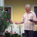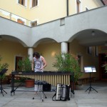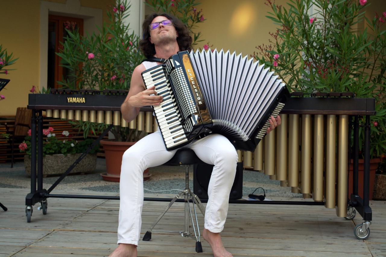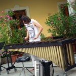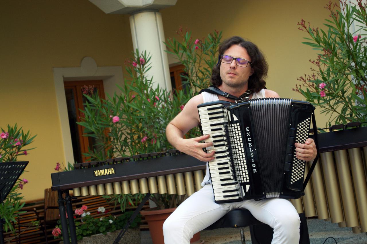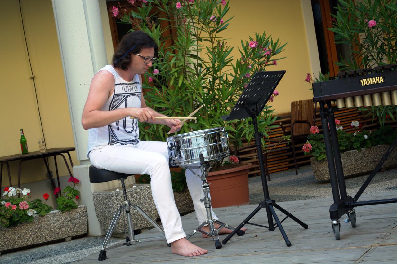 V nedeljo, 5. julija, je naš atrij zadonel pod lesenimi paličicami profesorja tolkal, Grega Gorenška, iz Konzervatorija za glasbo v Mariboru. Poleg Salut de Geneve na snare bobnu, odlični priredbi Suite v H molu J. S. Bacha., ter izvedbi Koncerta za marimbo, nas je prof. Grega prijetno presenetil tudi s harmoniko ob skladbi Hello, Lionela Richieja in slovenske Moja dežela.