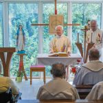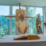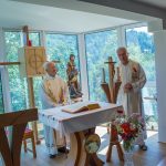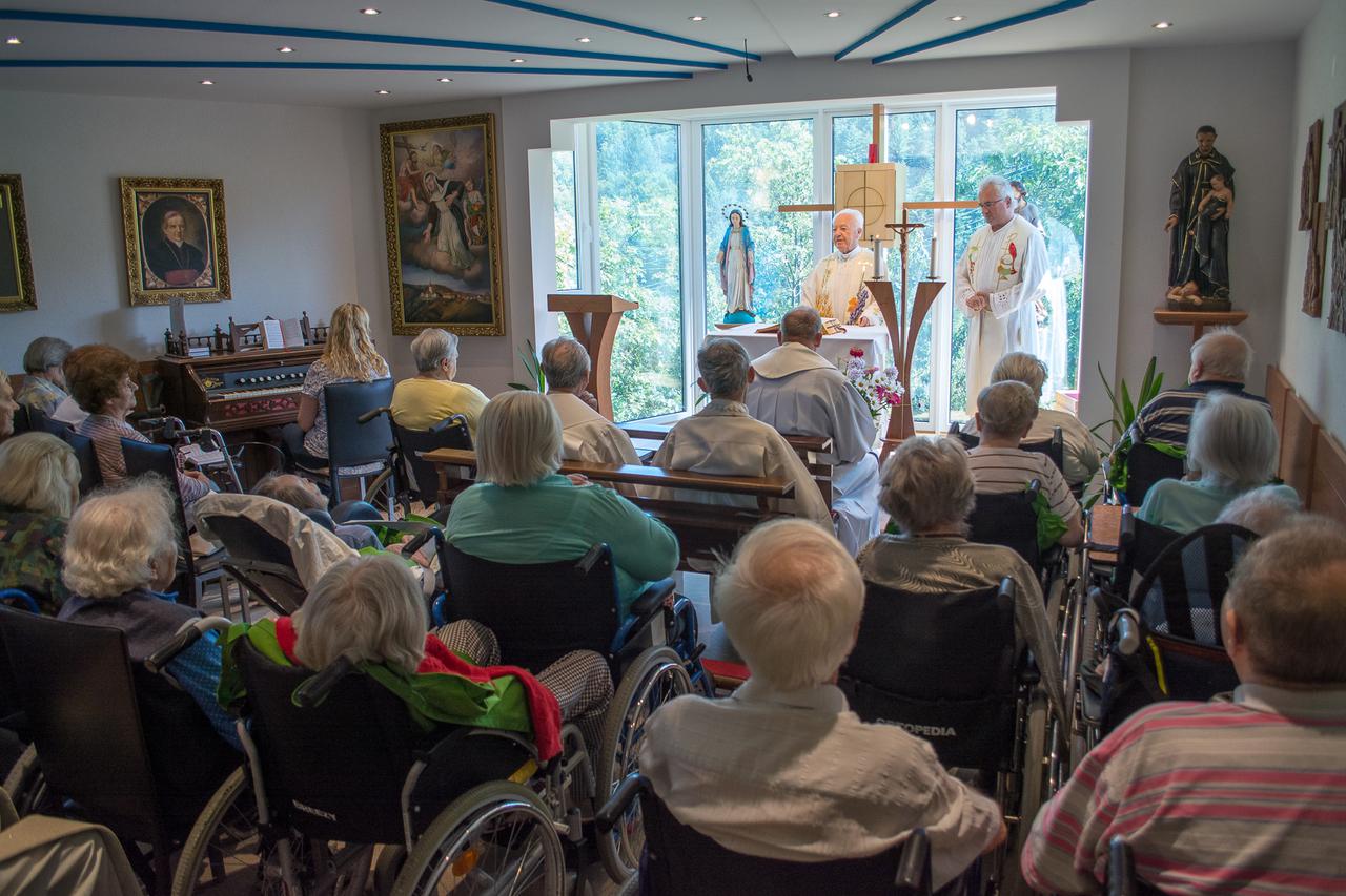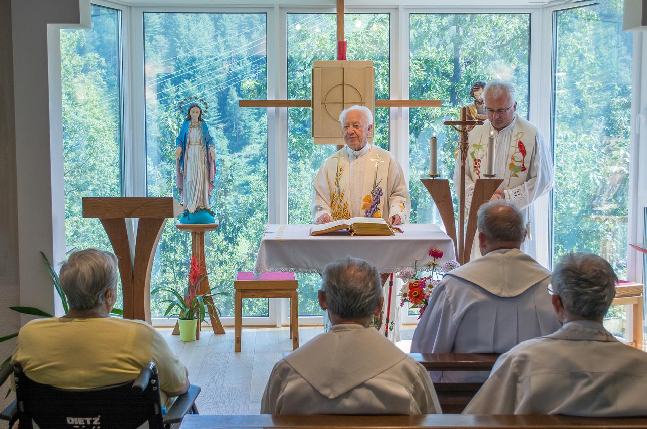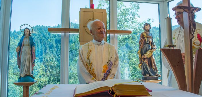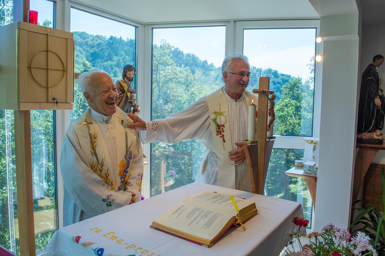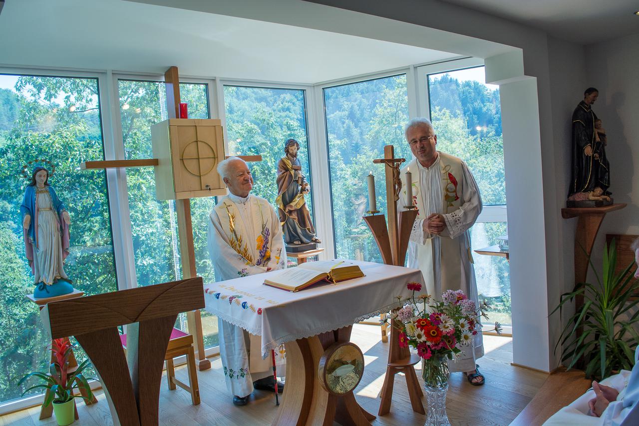 Ob sredah v Domu sv. Jožef darujemo sv. mašo v zavetju kapele sv. Eme. Položena tik ob vrhove dreves in modrino neba nas simbolno povezuje z naravo. V takšnem okolju misel prosto plava in se, pogosto zaradi zapete pesmi, ustavlja ob dogodkih, ki so kakorkoli zaznamovali naše življenje. Uvodna pesem te sredo, 19. 7. 2017, nas je navdala z zahvalo in obudila spomine na čase, ko smo prepevali: »Novomašnik bod´ pozdravljen!« Zagotovo je nagovorila vse zbrane, a se je na poseben način dotaknila zlatomašnika g. Alojzija Kostanjška, dolgoletnega župnika na Ljubečni, ki je z nami daroval svojo zlato mašo. Pot bi ga lahko vodila med zdravnike, a je izbral duhovniško pot. Hvaležni smo, da jo, tako kot še več njegovih sobratov, nadaljuje v Domu sv. Jožef. Življenje so darovali Bogu in Cerkvi, zato sadovi njihovega dela, povezani z življenjem drugih stanovalcev, zaposlenih in vseh, ki se srečujemo pri sv. Jožefu, po Gregorčiču »Bogu in domu žgo vreden dar.«